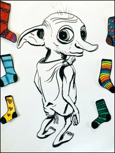 I drew Dobby onto a sheet of A3 cardboard and then made socks for the kids to stick on him with sticky tac. I had prizes for those that got their sock into his hand and for the funniest placement (which ended up being an earring).