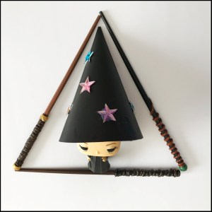 - A “Celebrity Head” style game — I had a plain black party hat and some stickers that I was going to write Potter character names on so each child could have a turn at guessing who they were.