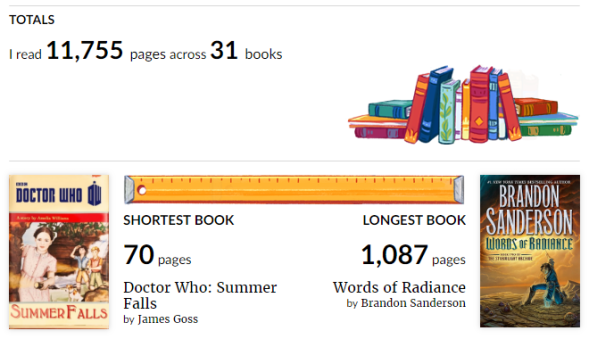 A lot of the blame here goes to Brandon Sanderson’s Stormlight Archive. When I set my Goodreads goal, I didn’t anticipate discovering (and adoring) this series, and each of these books is over 1000 pages. That’s three regular novels for one Stormlight one. I’m currently listening to the audiobook of the third one in the series, and the download is available in five parts. FIVE. If I hadn’t been reading them, I would have nailed my goal, for sure! 😉