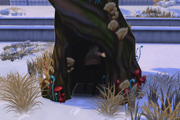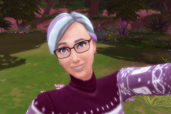 Aside from having vampires in the family, there are lots of other exciting occult things to write about, which is great if your Sim writes speculative fiction. Some of it depends on you buying different expansions, but some of it comes with the base game. Here we see Evelyn exploring a magical hidden glade through a mystical portal … and taking a selfie, because that’s how my Sims role.